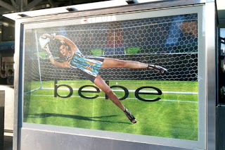 (click poster, shot in Manhattan by askacopywriter) Ah yes, the magic of retouching. She, heavy bangles and all, could probably fashion a clean sheet against the anaemic American attack, though. Uh, that shadow ain't quite right, bebe art director. Previously: Hyundai official World Cup car is an abomination.
